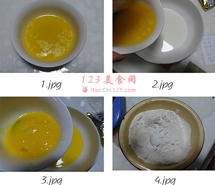 4、把面粉、泡打粉、盐、糖、混合均匀。