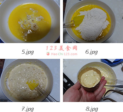 4、第6步搅拌面糊的时候,在干性材料全部湿润以后即可,以免面粉起筋导致组织粗糙。