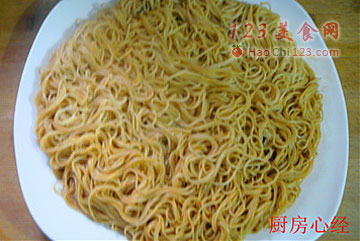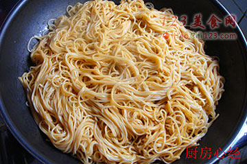 8、面条用麻油、酱油、盐拌匀后,入不粘锅,煎成面条饼,只需一面煎黄即可。