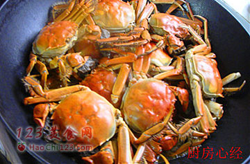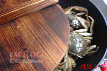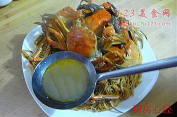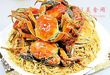 10、将蒸好的河蟹码在面条上,浇上锅中剩余的河蟹汁。让面条吸足河蟹的味道。