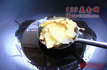 3、另起锅,放入麻油,再放入大量的姜片炒香。