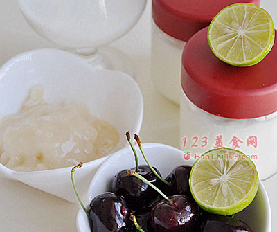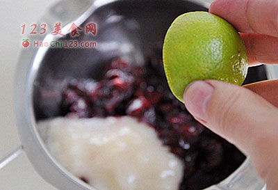2、挤入青柠檬汁。原方子写的是“鲜榨柠檬汁”,倒没说用什么柠檬。我觉得青柠檬的味道更清新,比黄柠檬更适合搭配樱桃的味道,所以就用的青柠檬。