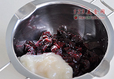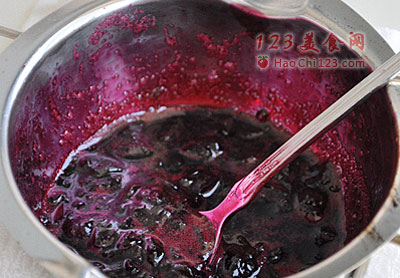 3、将樱桃、蜂蜜、柠檬汁的混合物用中火加热。边煮边用长勺子搅拌,避免糊底。煮至水分减少、变成比较粘稠的糖浆状就行了,将煮好的樱桃蜂蜜糖浆放在一边冷却备用。