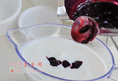 4、将牛奶、酸奶、剩余的蜂蜜混合,搅拌均匀。加入已冷却的樱桃蜂蜜糖浆。