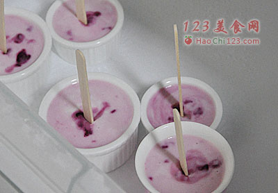 6、待冰棒冷冻至半凝固状态时(约90分钟),插入冰棒棍。继续冷冻至完全凝固即可。