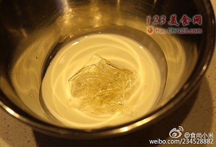 8、凉水泡软鱼胶片放入小碗奶油中。