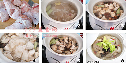 3、把香菇、口蘑洗净切块,放入锅中。