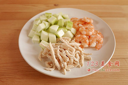 2、鲜虾处理干净,只取虾仁;鸡肉切丝;丝瓜刮去外皮,切小丁。
