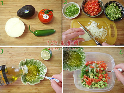 2、牛油果、西红柿(去籽)、墨西哥辣椒(去籽)、甜洋葱切成相同大小的小粒。