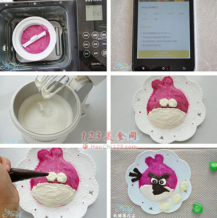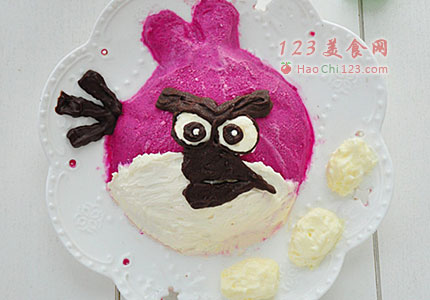 10、做好的冰激凌用勺子挖进盘子里抹成愤怒小鸟的形状,放冰箱冻硬后取出抹上奶油眼睛和肚子。