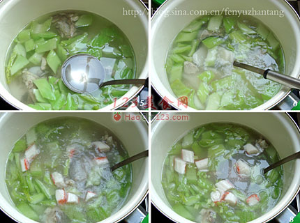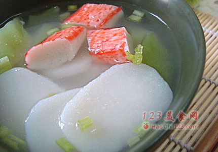 7、8、年糕软糯加入蟹肉棒和芹菜粒即可(蟹肉棒一烫就熟,煮久会散开)。