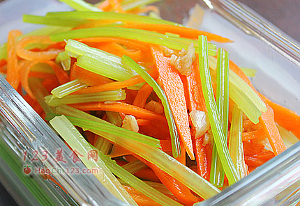 6、将控水后的蔬菜放到大的沙拉盆里,加入调料汁拌匀后腌制半小时入味后即可食用。
