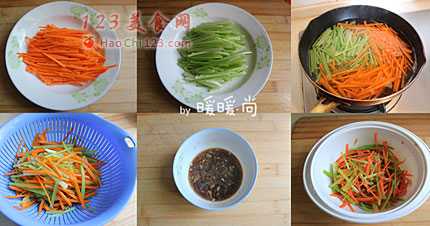3、开一锅开水,水开后放一小勺盐进去,再将切好的胡萝卜和芹菜段烫一下。