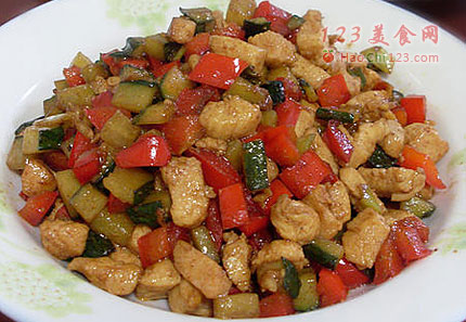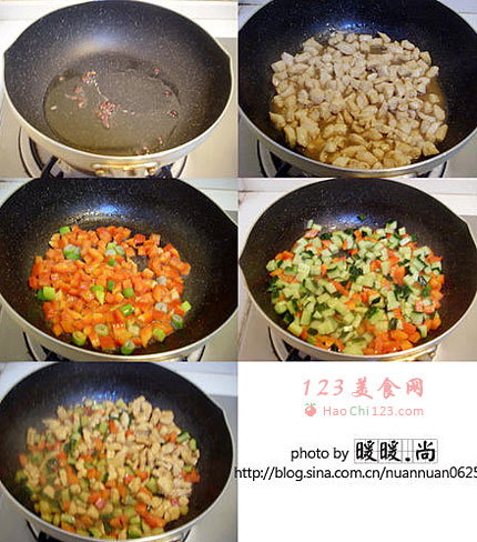 6、下入鸡丁,滑炒2-3分钟,边炒边用筷子将鸡丁拨散,至鸡丁变色盛出备用。