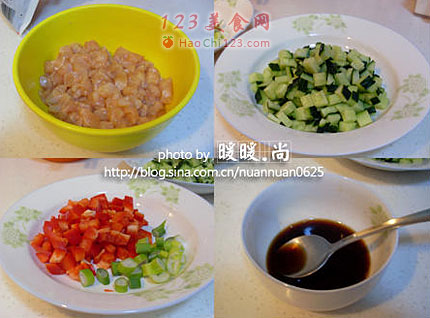 8、下入黄瓜丁,加适量盐,翻炒均匀。