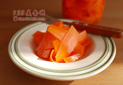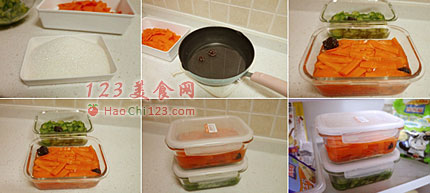 4、先在白砂糖中加1小匙盐,再将糖,盐,白醋一起入锅煮匀,小火煮,将砂糖融化均匀,这时加入2-3颗话梅,关火后将糖醋汁放凉,再拌入胡萝卜中,放在冰箱冷藏,腌制2天后就可以开始吃了。