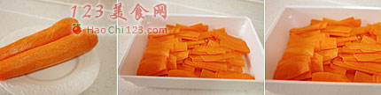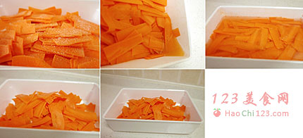 2、把胡萝卜片放入容器,加一大匙盐抓匀,然后放在一边腌2个小时,腌到胡萝卜变软,出水,这时在胡萝卜中加入等量的清水,清洗后将胡萝卜的水分拧干,或者用专门的工具将蔬菜甩干,以免腌制时味道变淡。