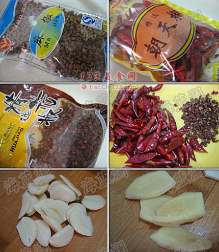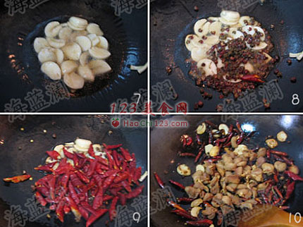 3、6-9图,锅中留适量底油,放入蒜片爆香,下干辣椒段和花椒、麻椒,炒出麻辣香味。