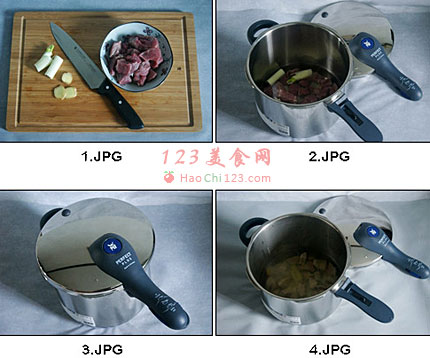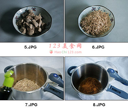 7、再次将碾好的肉丝放入高压锅内,加入适量儿童酱油。
