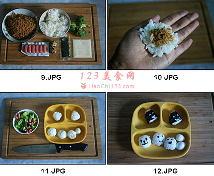 11、三角饭团可包裹奶酪,顶部蘸取适量肉松。