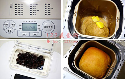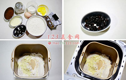 1、除黄油和蜜枣之外的材料,按照先液体再粉类的顺序依次放入面包桶。
