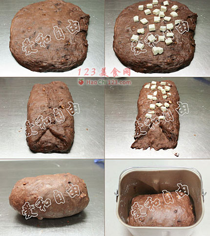 3、结束揉面前5分钟时,加入巧克力豆、榛子仁和核桃仁。