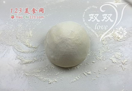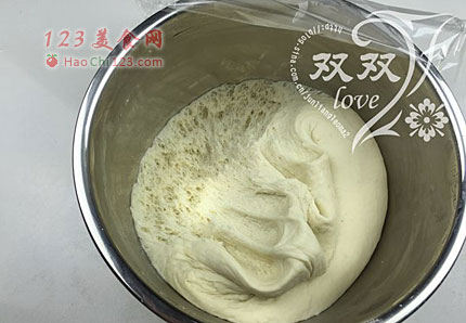 2、清水花开酵母粉,加入面粉,揉成面团,静置发酵至2倍打。发酵完成。