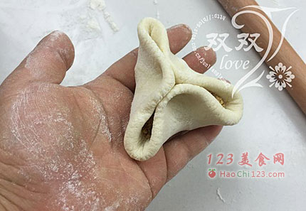 5、取一个皮,舀入馅,压实。将皮收拢,将其分成3份,中间位置捏合。