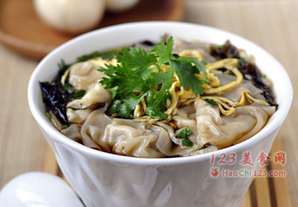 13、准备汤头的同时煮馄饨:水要宽,大火沸腾后下入馄饨,立即用汤勺推开防粘锅,煮至馄饨漂浮,转中火再煮片刻,即可。