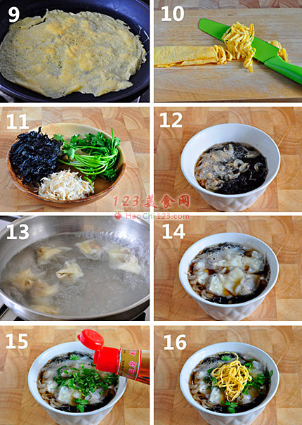 12、碗底放入适量酱油、醋、胡椒粉、盐和糖,再放适量紫菜和虾皮,冲入热鸡汤(开水或煮馄饨的汤水均可)。
