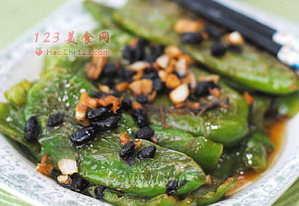 6、加入青椒、少量水、盐、糖、生抽、醋、鸡精,将调料炒匀即可,注意不要翻炒过度不然青椒会过蔫。
