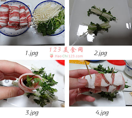 2、香菜和金针菇打成比羊肉卷短的节。