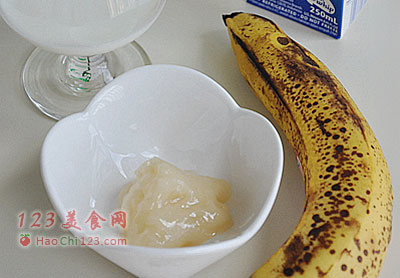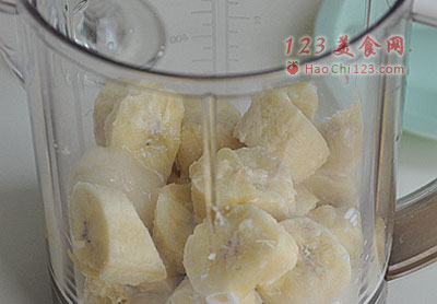 2、将香蕉果肉切成块,倒入搅拌机中。加入蜂蜜、鲜牛奶。