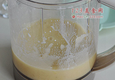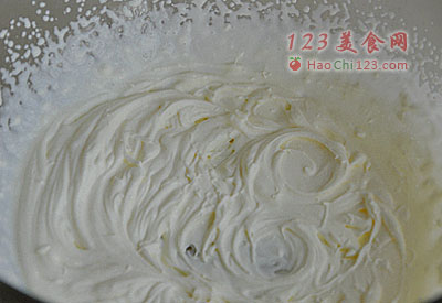 4、将淡奶油打至七八分发,然后和香蕉果泥混合拌匀。