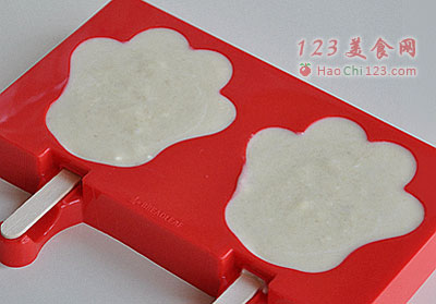 5、倒入雪糕模具中,插上雪糕棍儿,送入冰箱冷冻至完全凝固。吃时取出脱模即可。