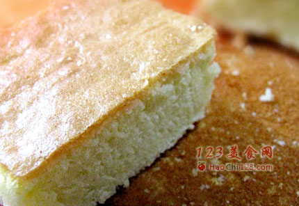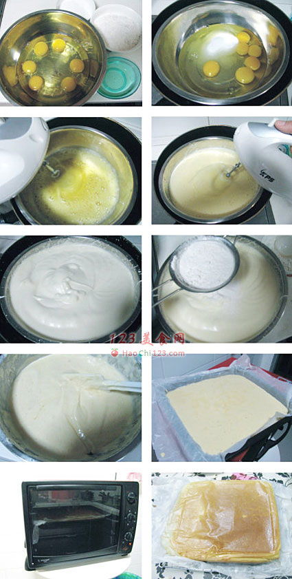 5、6、在烤盘里铺上油纸,把拌好的蛋糕糊全部倒入烤盘。
