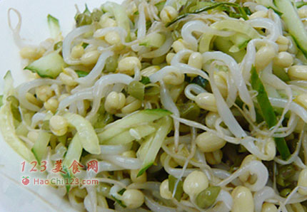 3、取一小盆,放入绿豆芽和黄瓜丝,加入蒜泥、盐、花椒油、糖、醋拌匀即可。