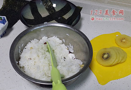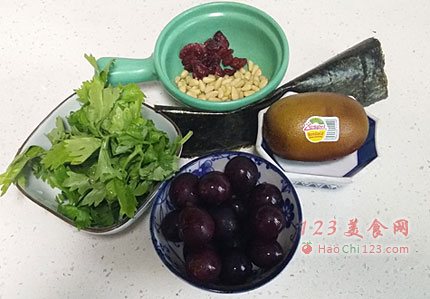8、将葡萄、芹菜叶、金果片摆在米饭旁。