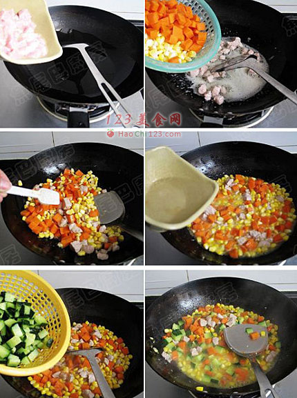 8、快速翻炒几下,倒入红萝卜、玉米粒。