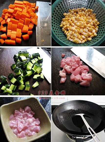 1、红萝卜洗干净,削去外皮,并切成小粒。