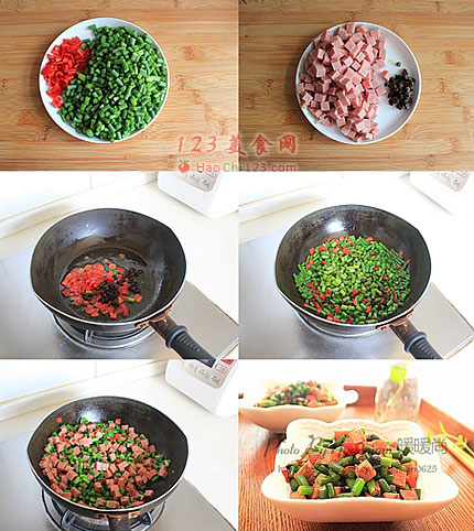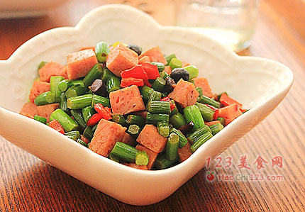 5、下午餐肉丁,调入5g的生抽,炒至蒜苔表面略微变皱即可。