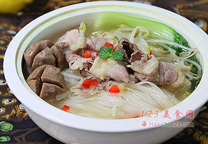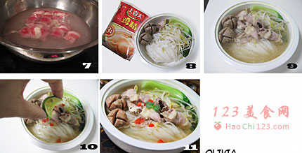 7、将生牛肉片在锅中汆水,熟后捞出(也可直接在碗中用热汤烫熟)。