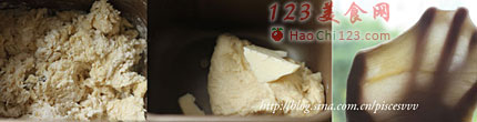 6、放入软化后的黄油,揉至完全扩展阶段。