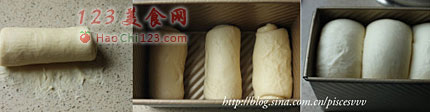 11、将卷好的面团排入吐司模中,放温暖湿润处进行发酵。