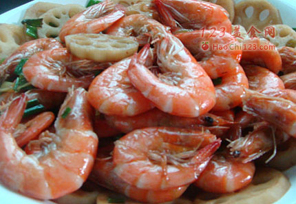 4、重新起锅烧热加油、放葱头稍炸片刻入虾爆炒,加生抽看虾变色后到入炒好的藕同炒淋上老酒出锅即可。