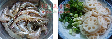 2、虾洗净去泥肠、剪去头须。将嫩藕切成薄片,浸泡在清水中加一小勺醋。