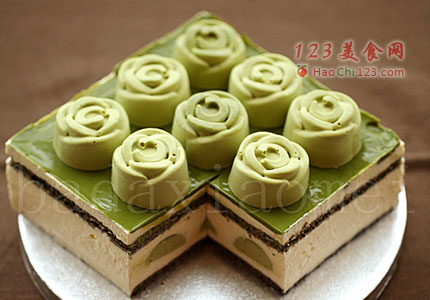 18、取出后将之前剩余的抹茶牛奶液倒在表面,冷藏过夜,最后用玫瑰造型的抹茶奶冻装饰即可。