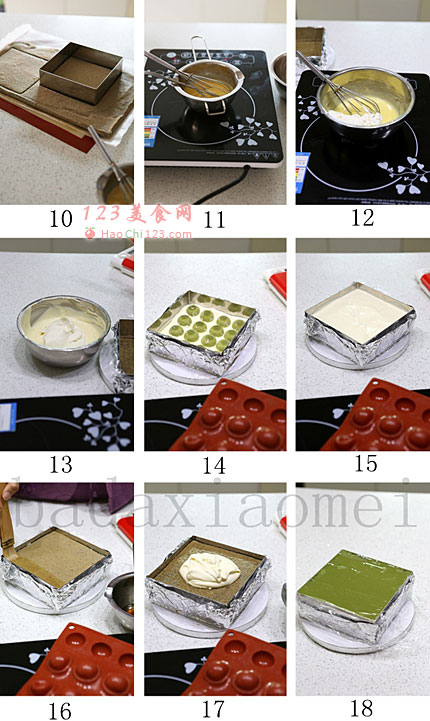 14、模具包裹一层保鲜膜再包一层锡纸,放一片黑芝麻蛋糕,刷糖浆,一次稍干后再刷第二次。倒入一部分马斯卡朋乳酪慕斯,中间部分放上半圆模的抹茶奶冻。
