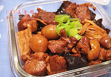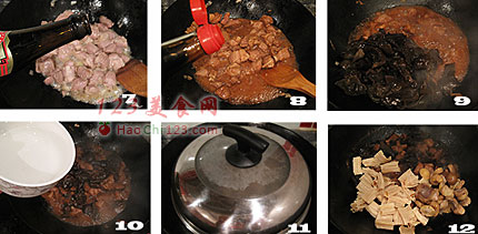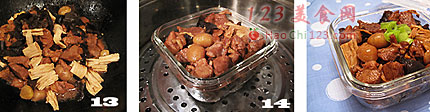 12、焖制好的羊肉中放入腐竹段和板栗,翻炒均匀。