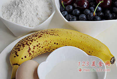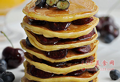 10、香香软软的香蕉松饼,出锅就可以吃了——但,如果想再提升一下口感,可以搭配一些水果(这次我用了蓝莓、樱桃)和枫糖浆。枫糖浆的味道清甜,和松饼特别搭,吃起来甜而不腻,再夹上切成小块的樱桃果肉和蓝莓,营养也更全面。